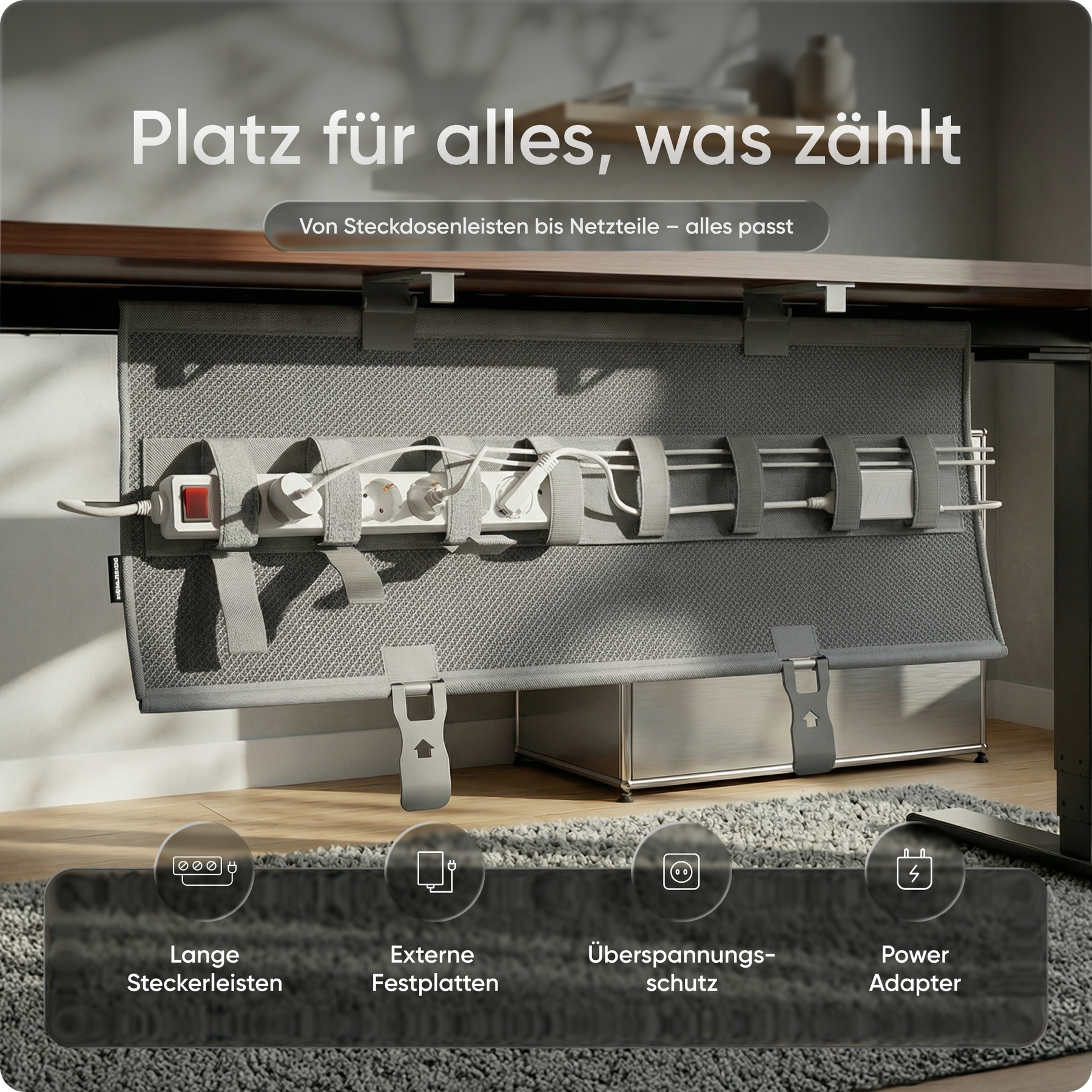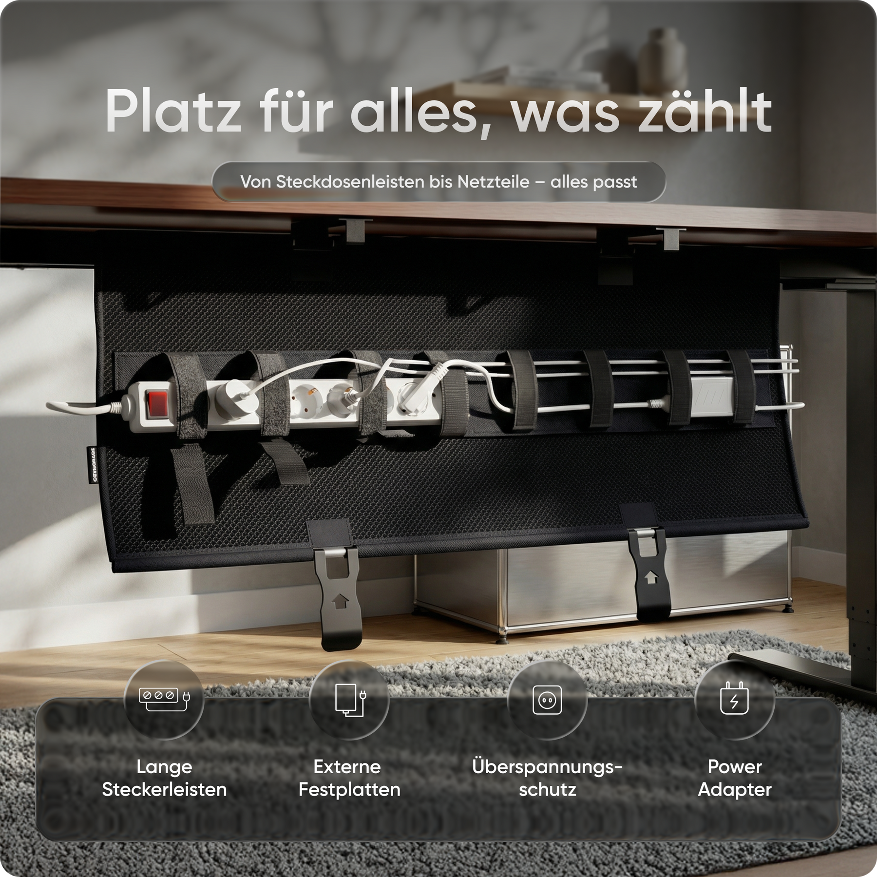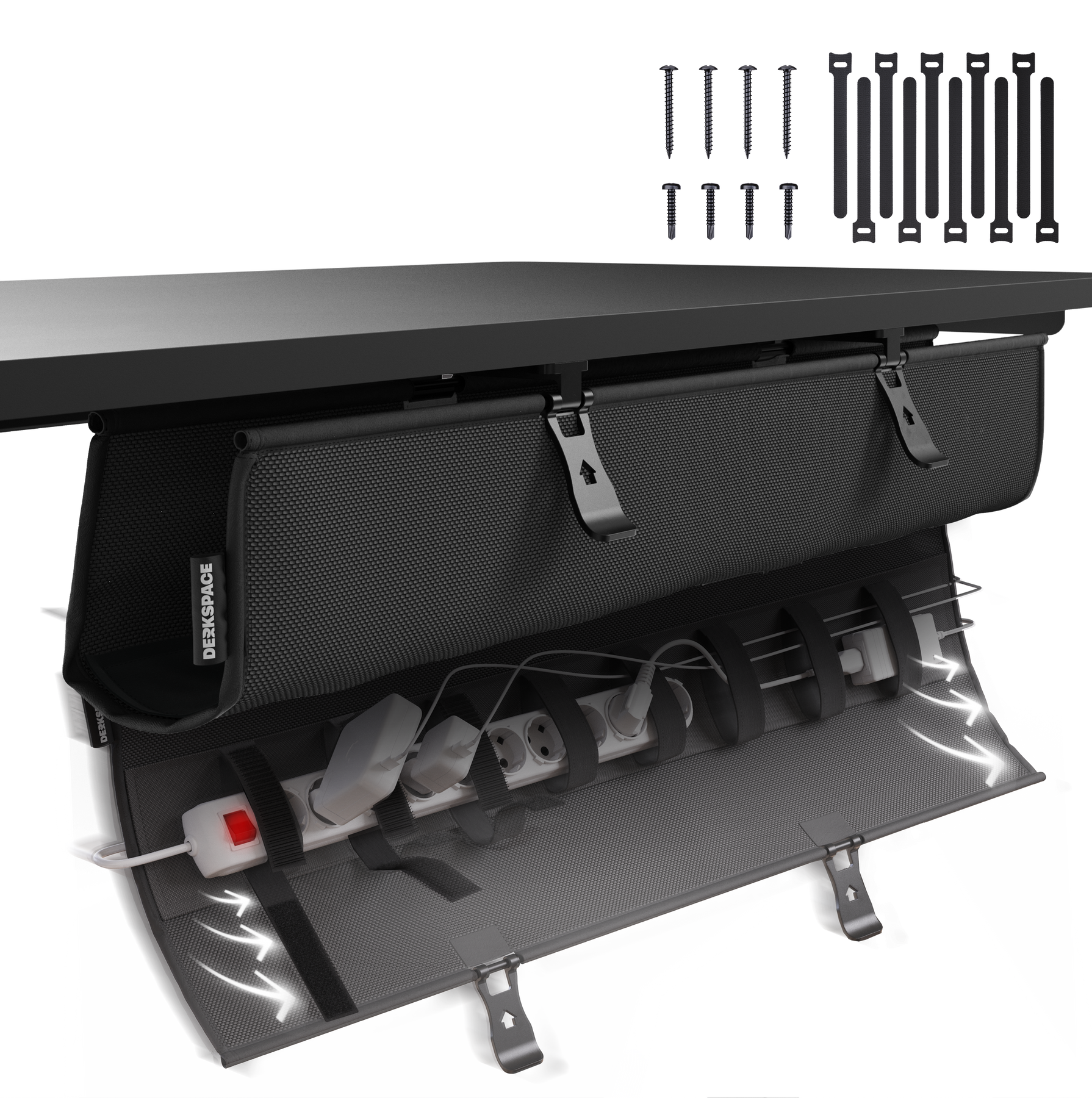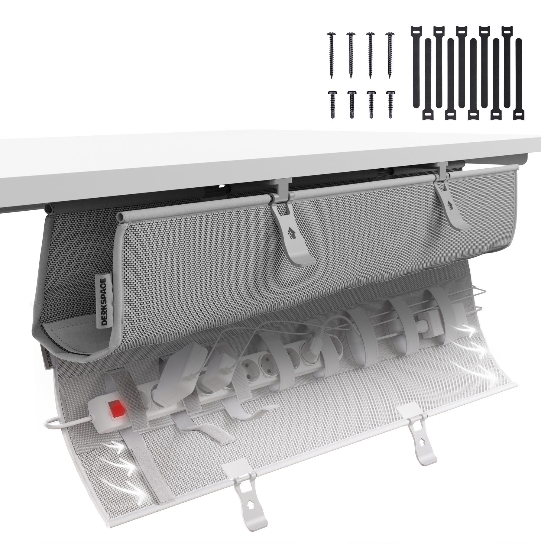 Mit integrierten Klettverschlüssen bringt die Kabelwanne Struktur in dein Setup – schnell, sicher und dauerhaft. Schluss mit Kabelchaos: Alles sitzt an seinem Platz, ganz ohne Werkzeug oder Aufwand – für maximale Übersicht, ganz ohne Stress.