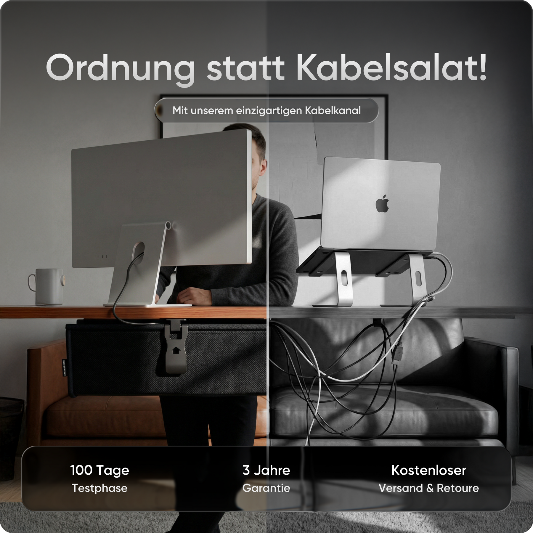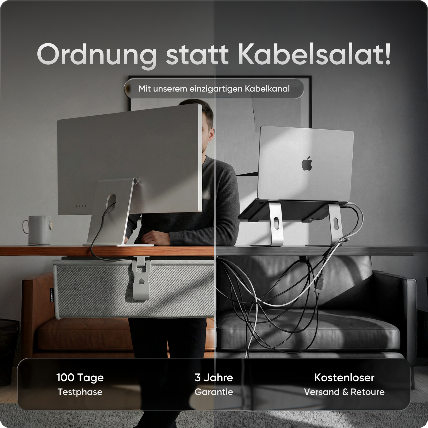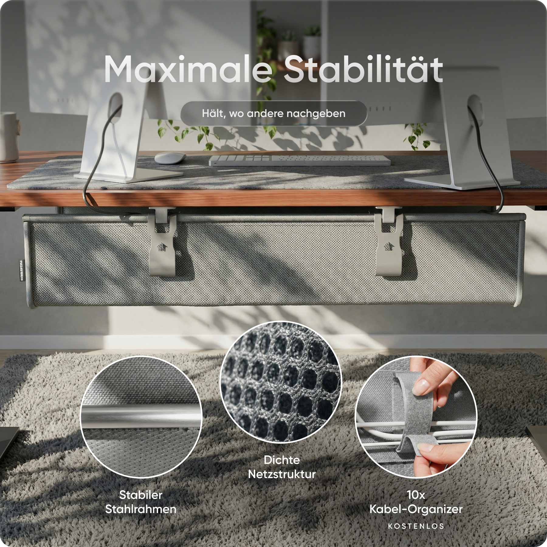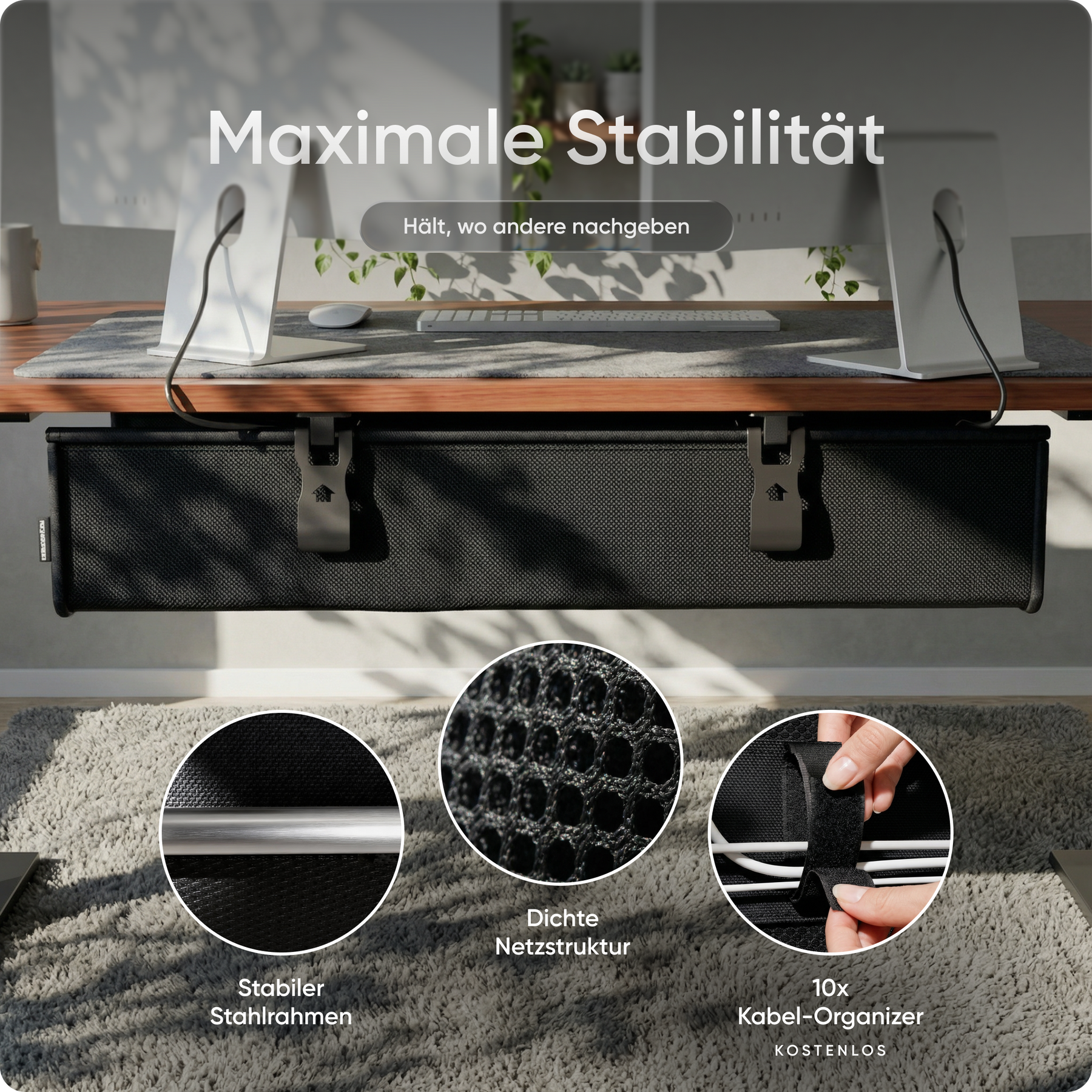 Die praktische Kabelwanne sorgt für Ordnung unter dem Tisch und versteckt Stromleisten, Netzteile und Kabel im Handumdrehen. So wirkt dein Arbeitsplatz aufgeräumt, professionell und frei von Ablenkung.