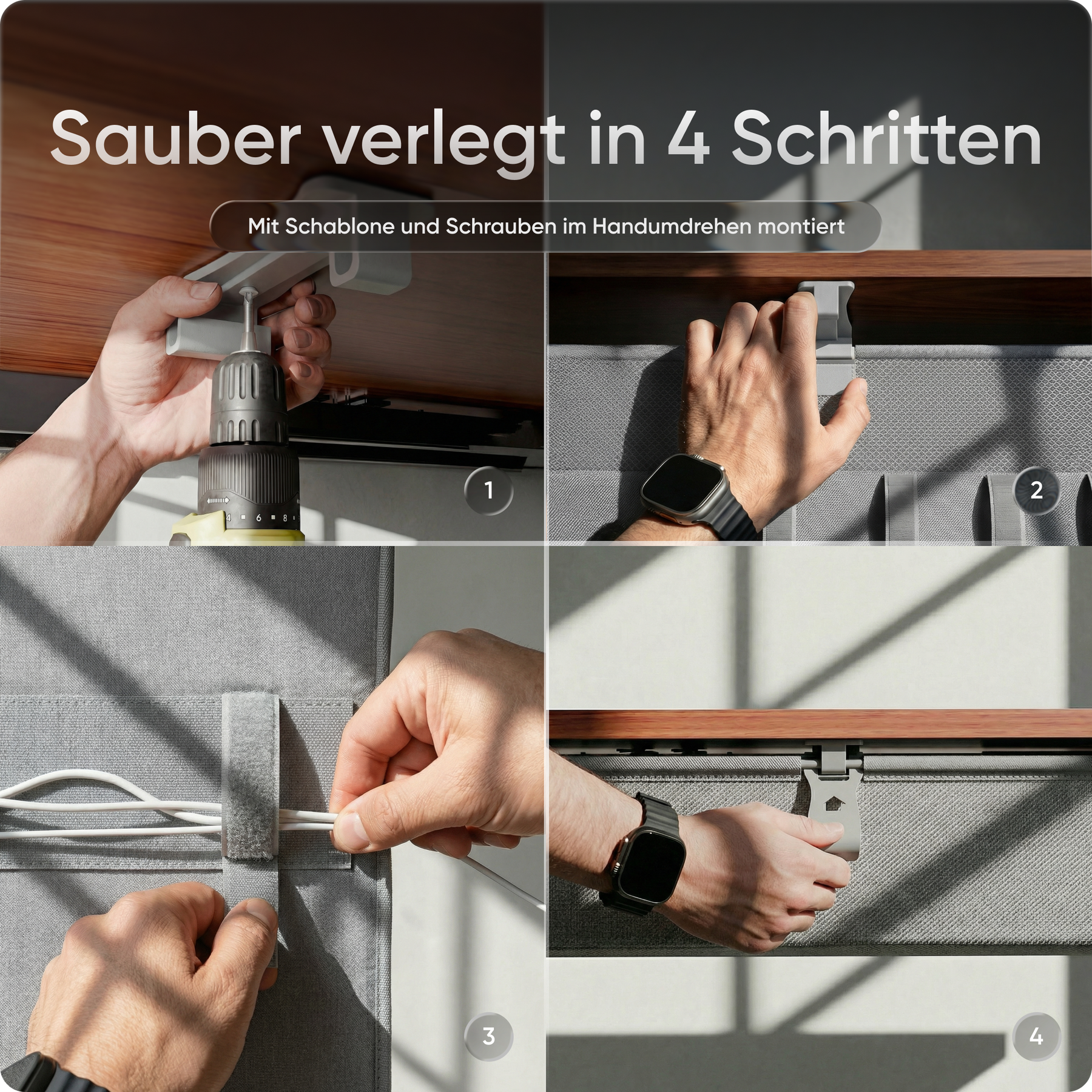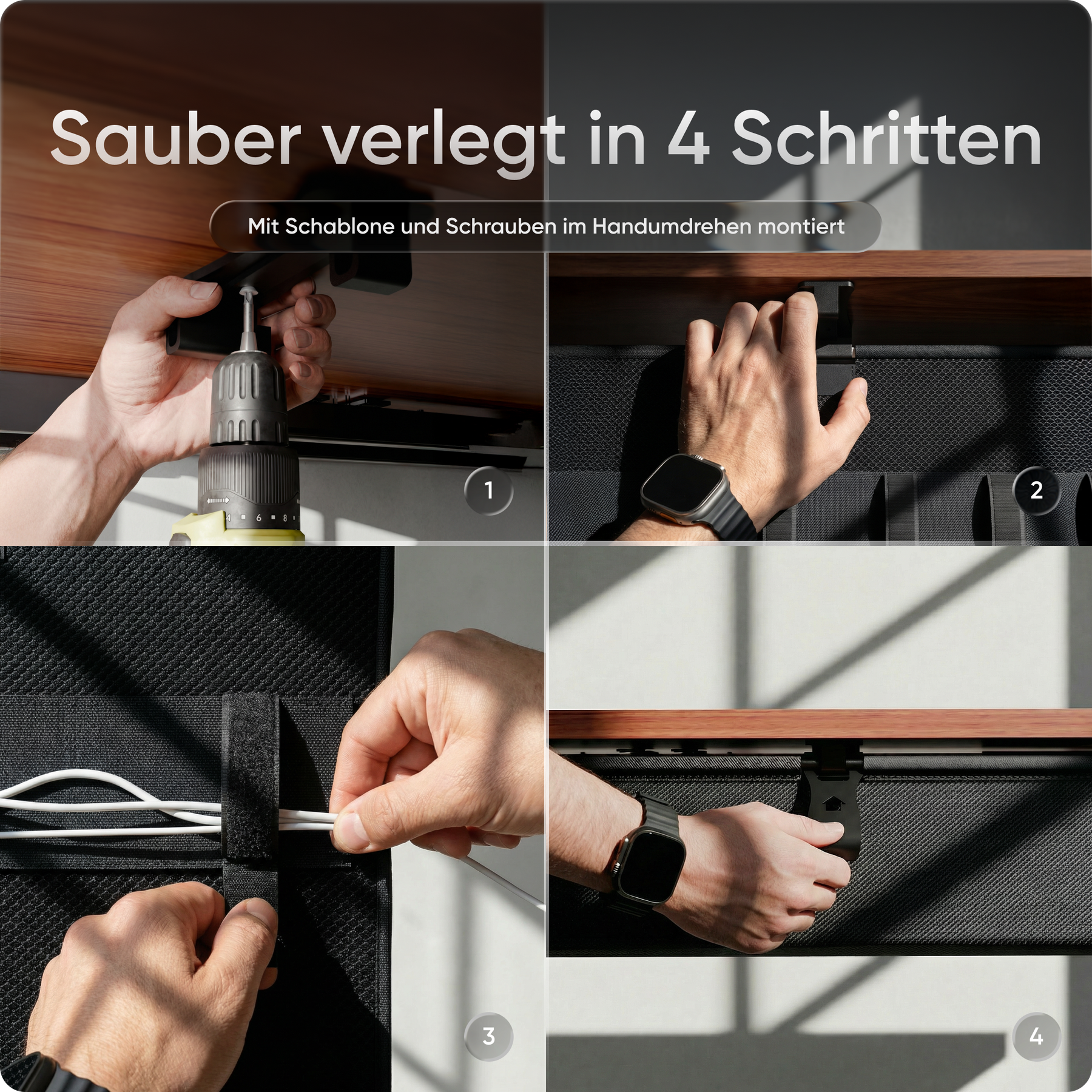 Das innovative Befestigungssystem macht die Installation zum Kinderspiel: In wenigen Minuten sitzt alles fest. Die Kabelwanne passt sich dabei flexibel an jede Tischform an und verschwindet unauffällig unter der Platte.